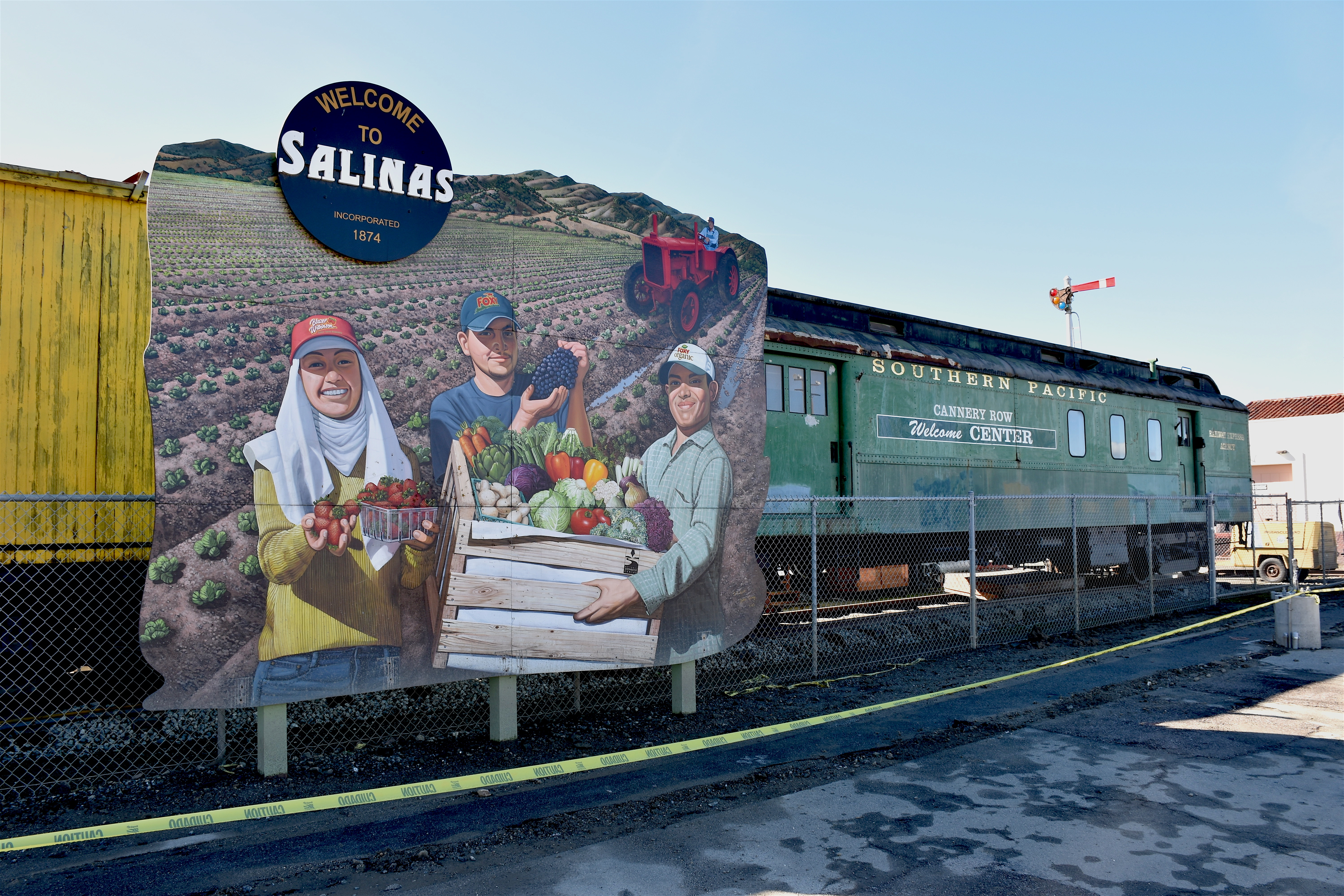 Freestanding Mural in front of historic rail cars at Salinas Amtrak station.