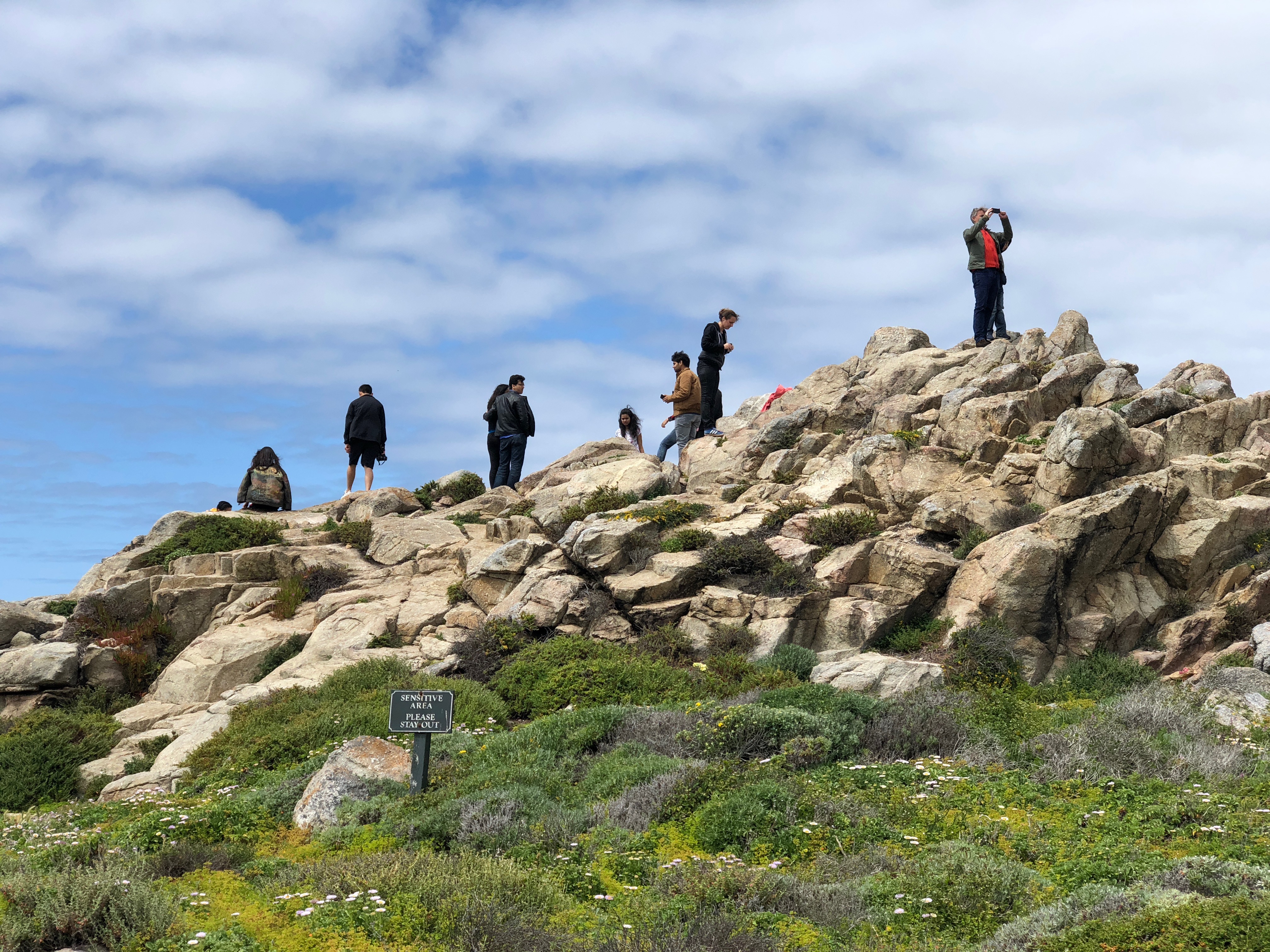 This is one of the turnouts along the 17 Mile Drive. The sign asking people to stay out is clear and anyone climbing up these rocks passes right by it. As the number of tourists increase and this kind of behavior becomes normal, the property owners (golf courses, individual homeowners, Pebble Beach Company) put up more walls, signs and barriers. The openness of the forest and beach has been destroyed by their popularity.