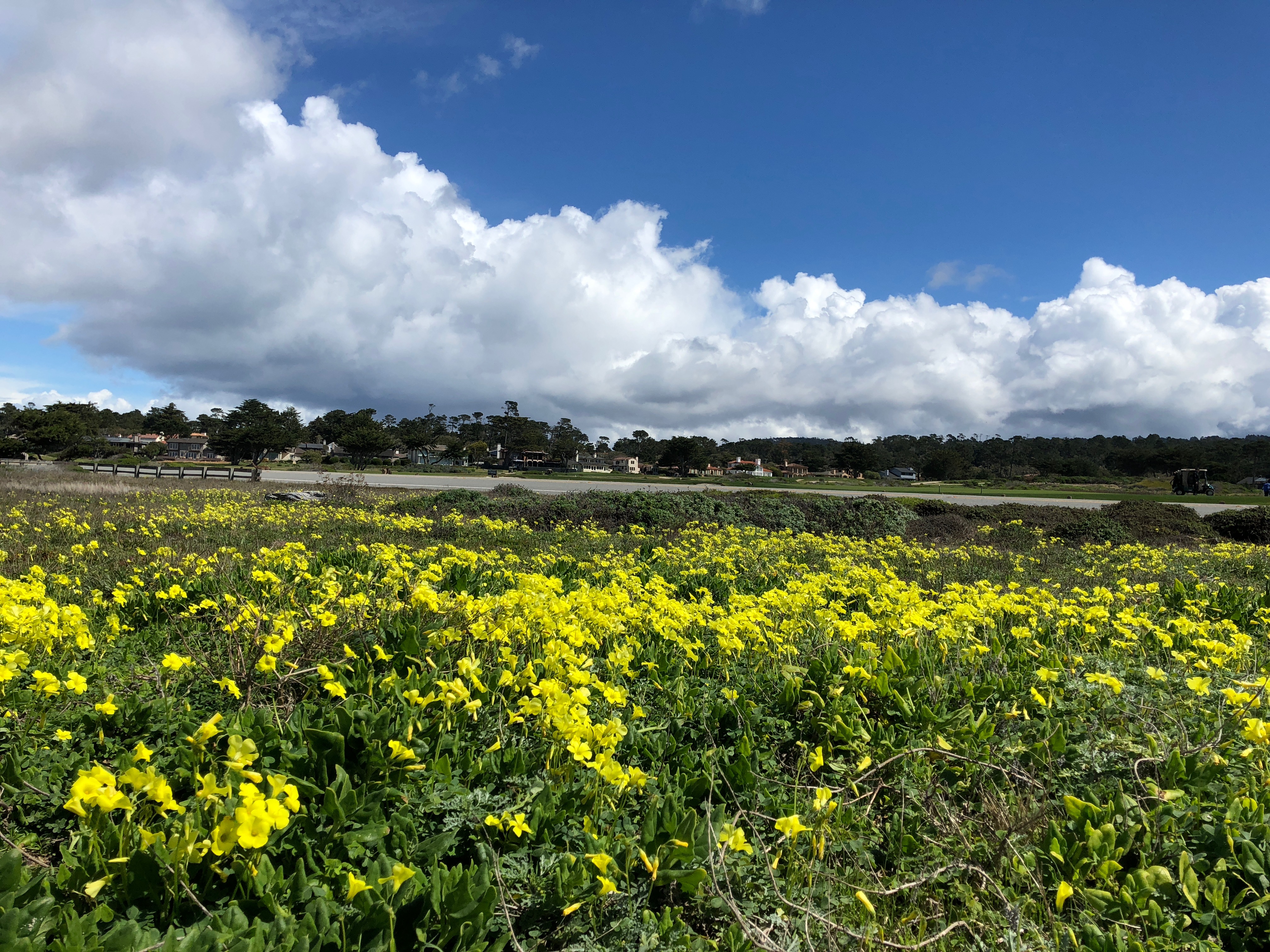 Big clouds gathering over the mustard along 17 Mile Drive