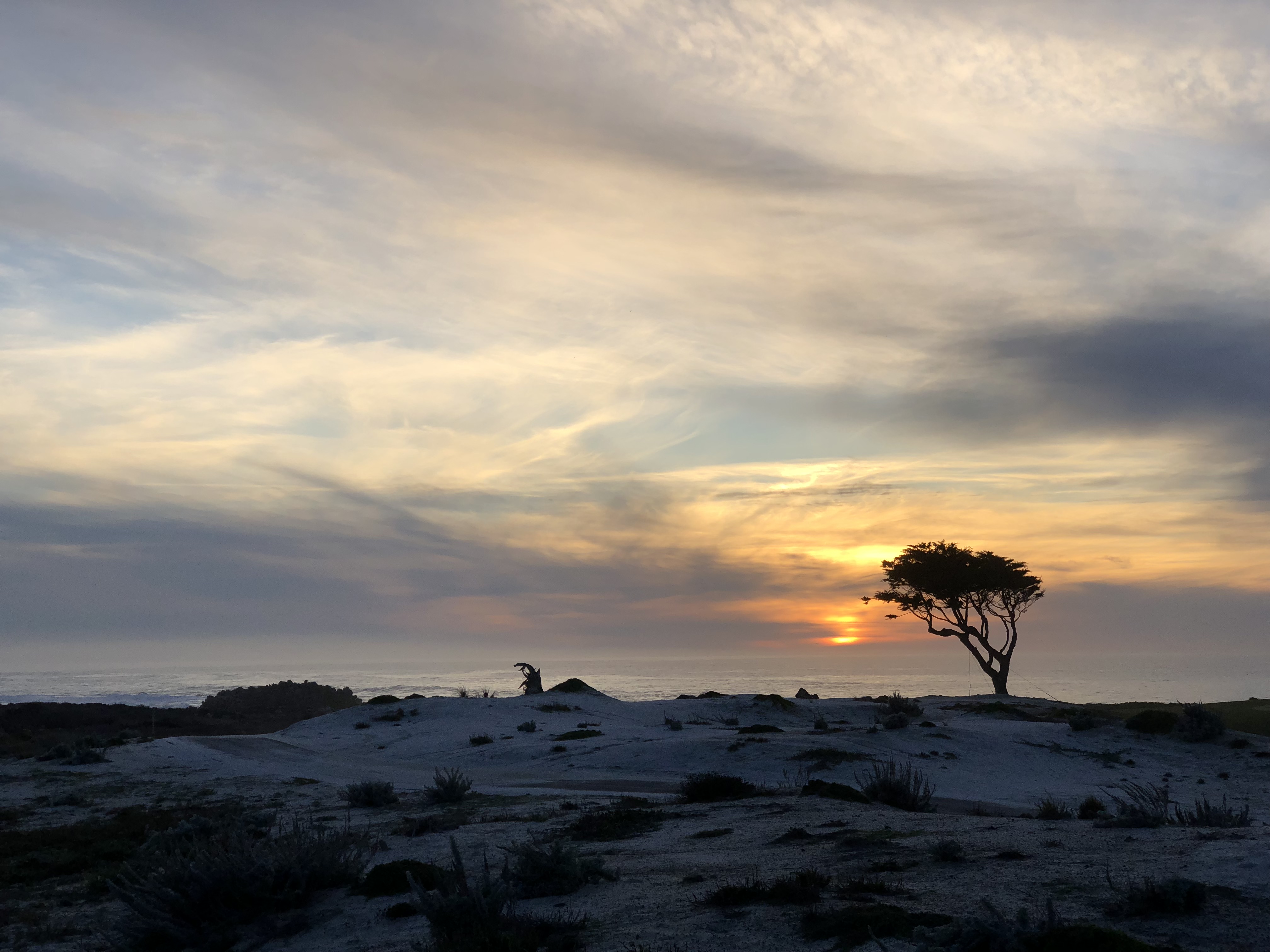 The Monterey Peninsula Country Club (MPCC) has two private courses; the Shore Course and the Dunes Course. We are fortunate enough to live right in the middle of them. Since we moved here in 1995 both courses have been completely revised. The first hole of the Shore Course is right across the street from us and the course winds to the south, then back up the hill to the clubhouse. The Dunes Course is to the north of us and it's signature hole is on the ocean side of 17 mile drive, with the tee among the rocks of Point Joe with the hole out near the water. The Dunes course has been redone twice since we've been here, the last brining in more 'dunes' of sand, reducing the amount of greens to keep watered. On the hole shown above, the club planted a mature Monterey Cypress.