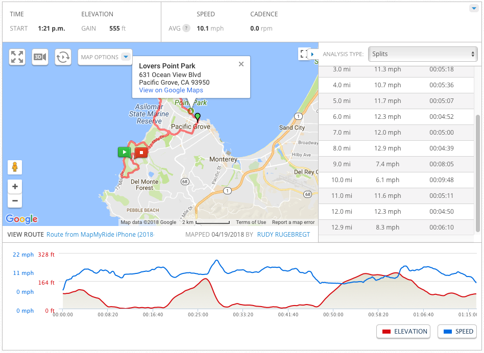 I have a iPhone App, Map My Ride, that tracks where I go, how fast I'm going, my cadence and my heart rate. This helps motivate me. In this example, I rode out to Pacific Grove along the water, came back through town and back on Stevenson Drive. This was 12.84 miles, took 1:16:28 (I took a break at the water in PG) and burned 936 calories.